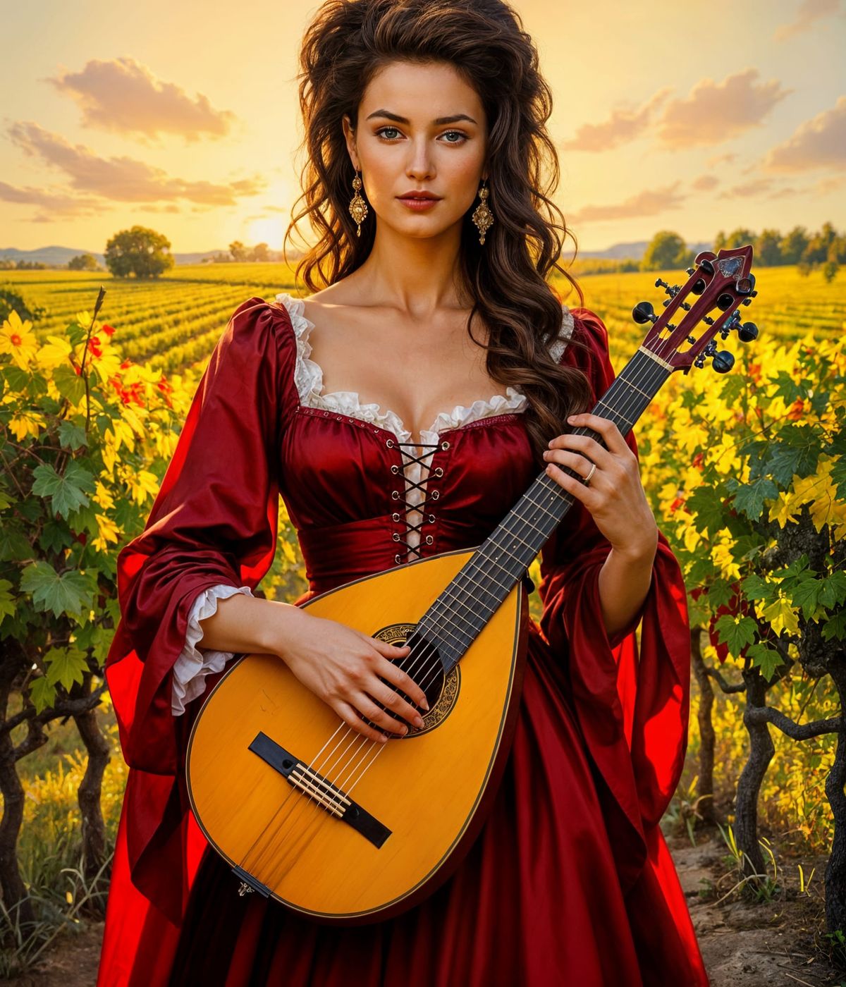 A striking picture of a medieval woman in a red dress with a lute, set in a sunlit vineyard. The artwork captures a golden hour ambiance with warm hues, reminiscent of fine art portraits with visible brush strokes.