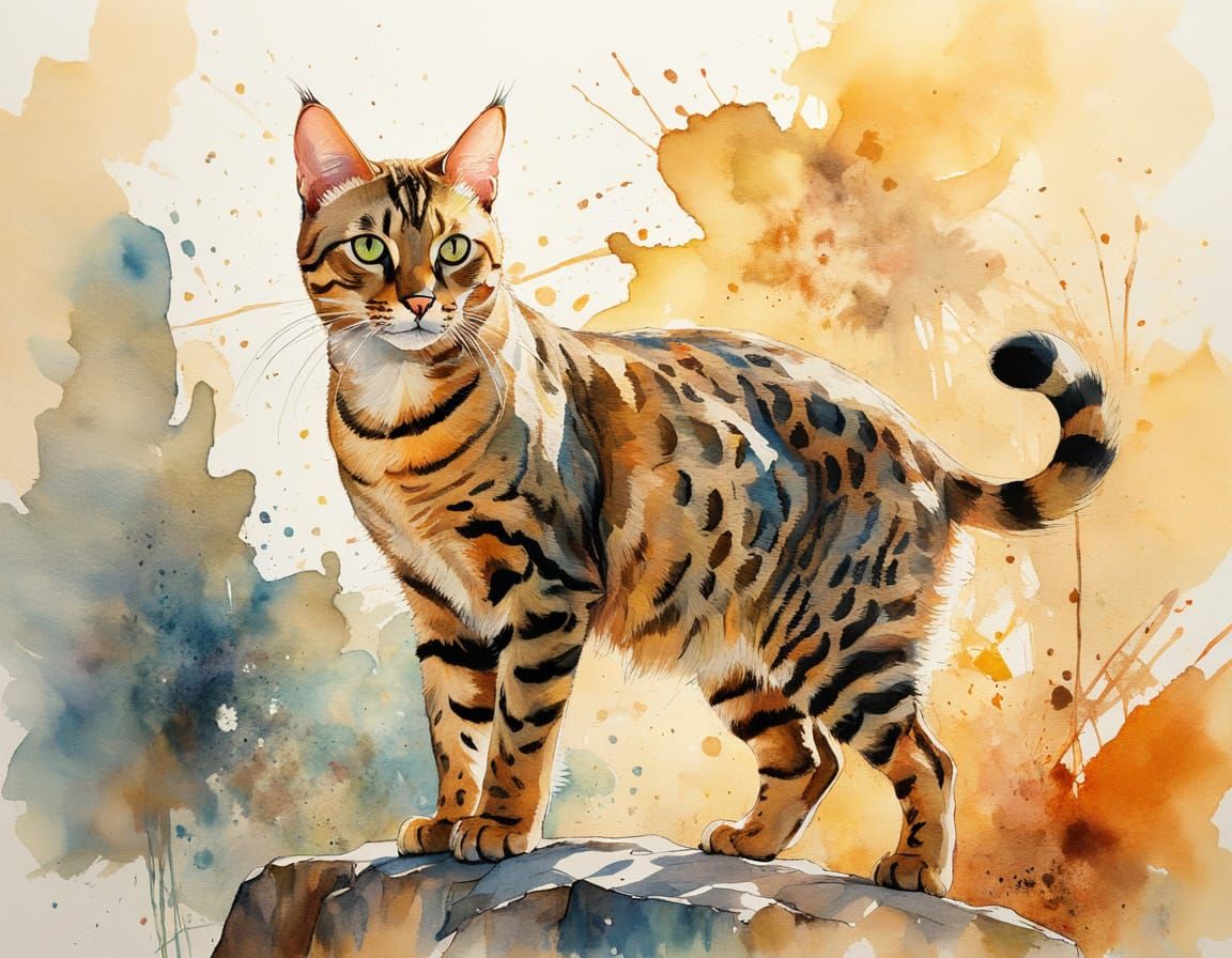 A striking picture of a Bengal cat perched on a rock with one paw raised. The image is rendered in a vibrant watercolour style with expressive brushstrokes and a warm, golden light.