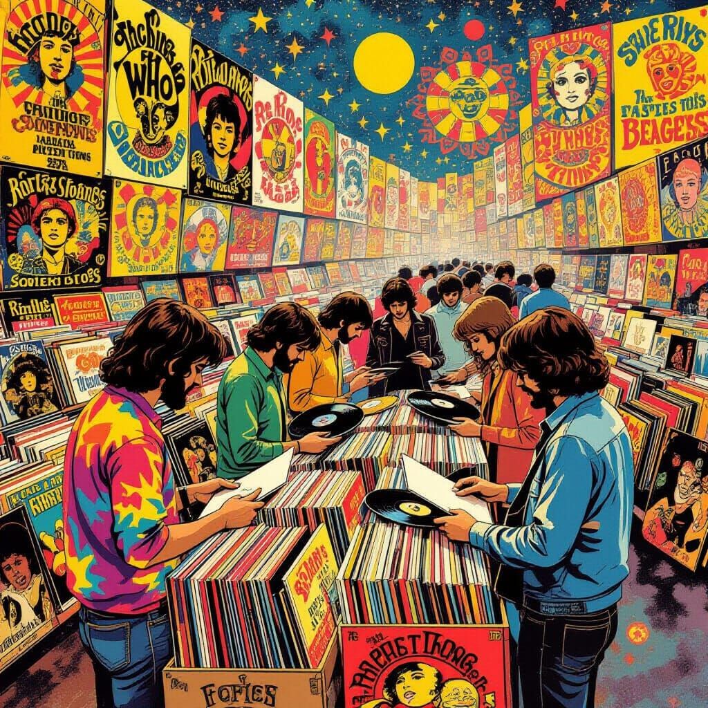 This image shows a vibrant vintage market scene filled with people browsing vinyl records, tie-dye clothing, and peace badges. The artwork has a psychedelic, illustrative style.