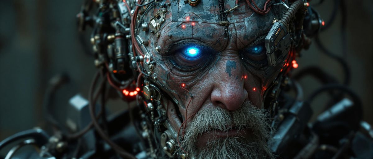 This image depicts a futuristic humanoid hybrid, blending Victorian cavalry style with extreme photorealism. The subject, an elderly man with a long goatee, wears worn leather and metal armor, with visible wiring and neon lights. His weary expression and heavy lines convey a sense of profound exhaustion,...