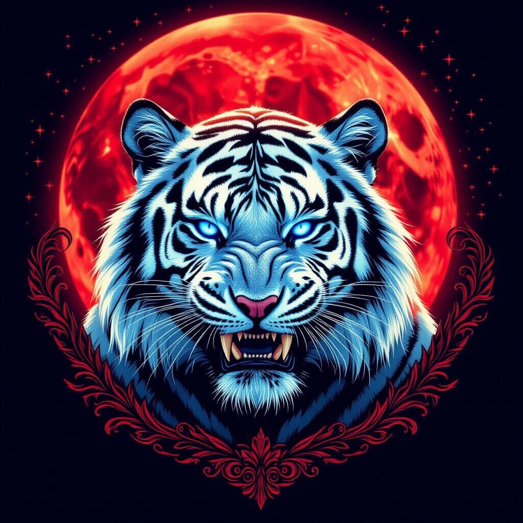 This image showcases a regal white tiger with glowing blue eyes and prominent fangs, set against a large, supernatural red moon. Designed as a symmetrical, mythic emblem, it evokes a haunting and cinematic atmosphere.