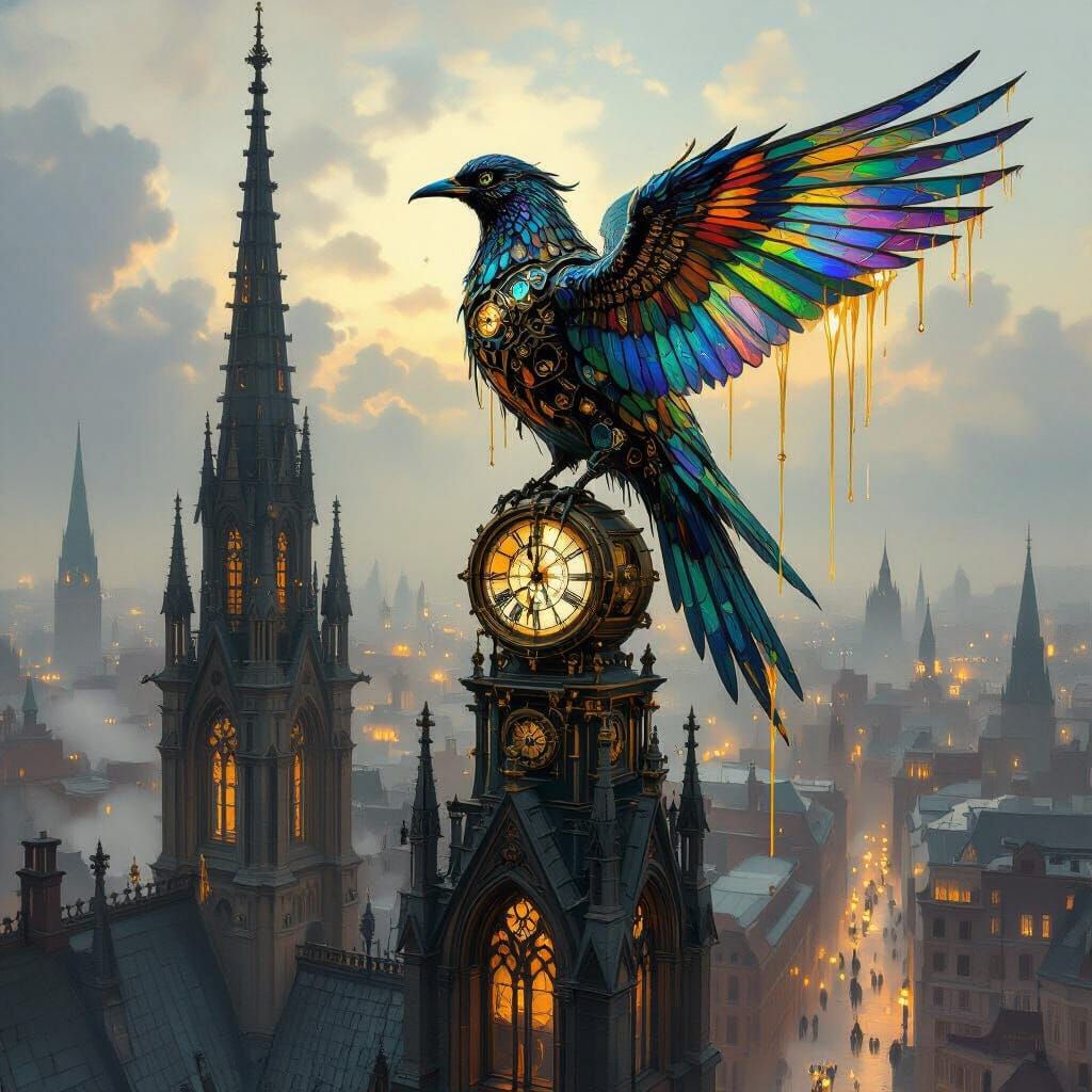 A colossal clockwork bird with iridescent stained-glass feathers rests on a gothic spire overlooking an impressionistic Victorian city. Tears of molten gold fall, set in a dreamlike, atmospheric scene.