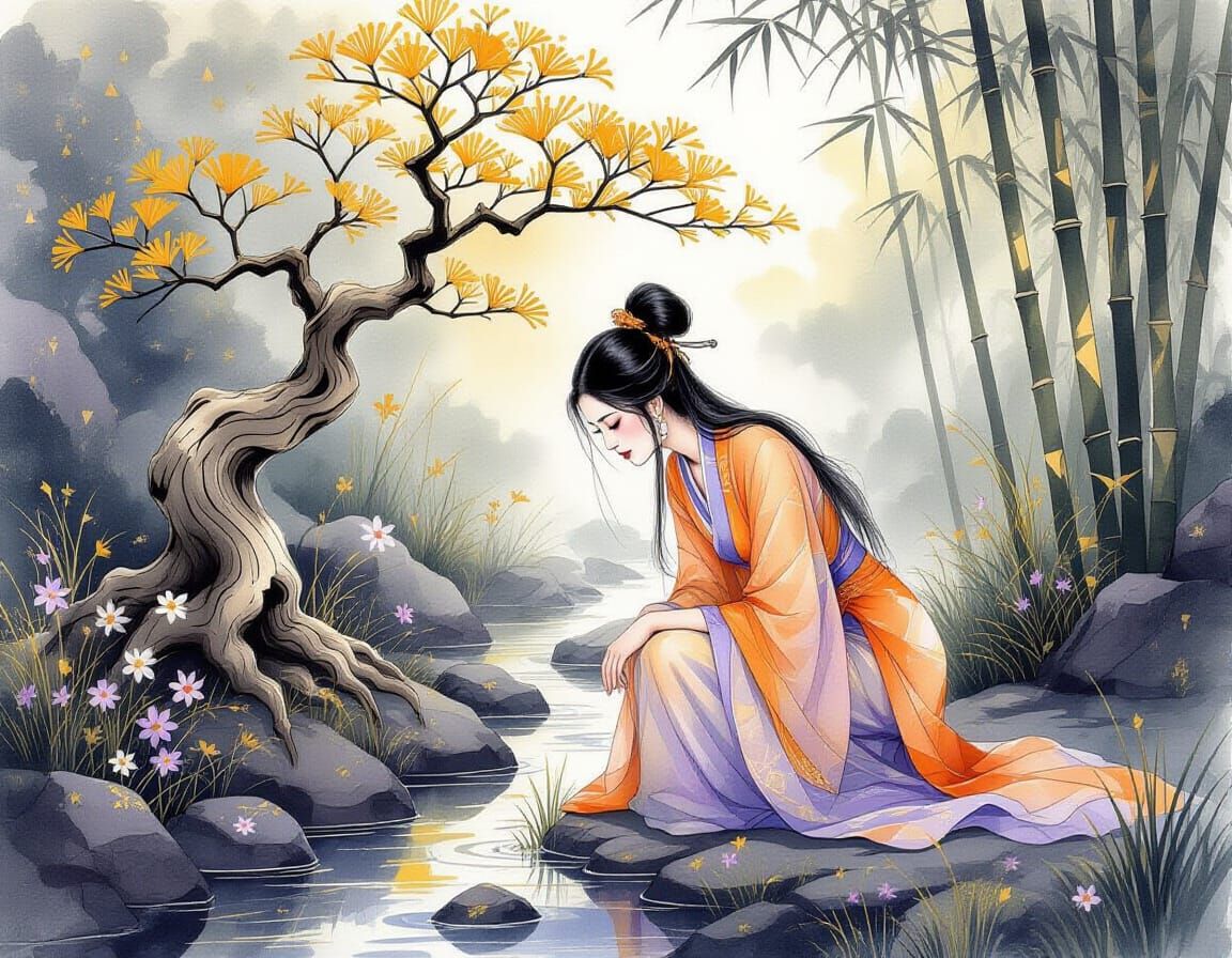 This image shows a Chinese woman in flowing robes kneeling before a ginkgo tree. Delicate flowers and grasses surround her in this ink painting with rich, varied textures.