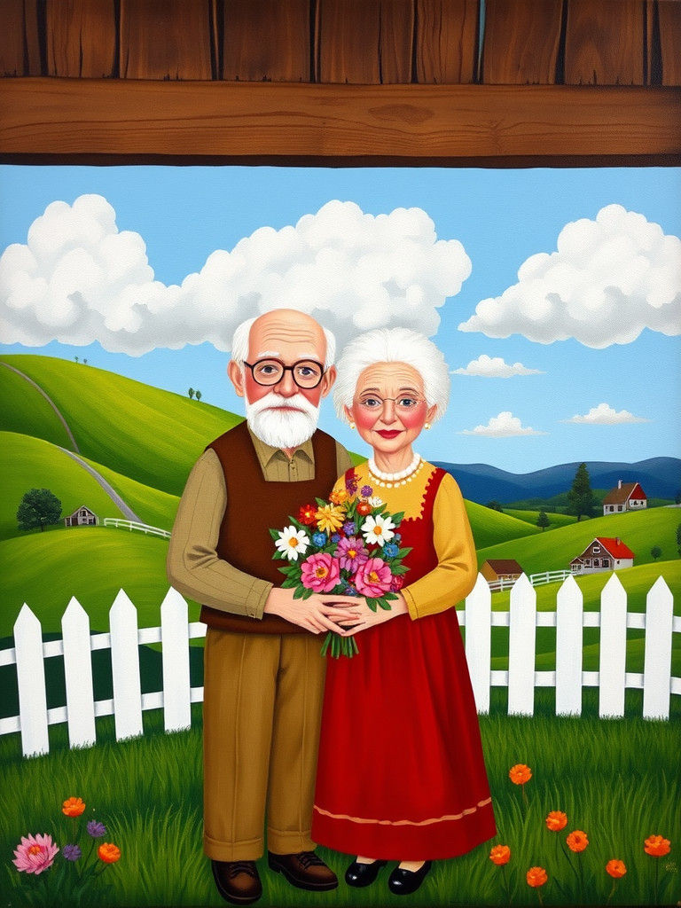 A vibrant folk-art style image of an elderly couple holding flowers in a bright countryside scene. The picture features simplified forms, flat planes, and cheerful colors.
