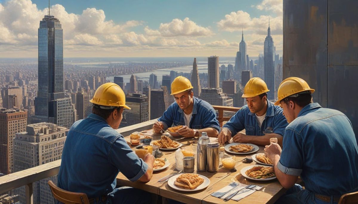 A vibrant painting shows construction workers enjoying lunch atop a skyscraper in New York City. The image captures a nostalgic, retro aesthetic with warm golden lighting.