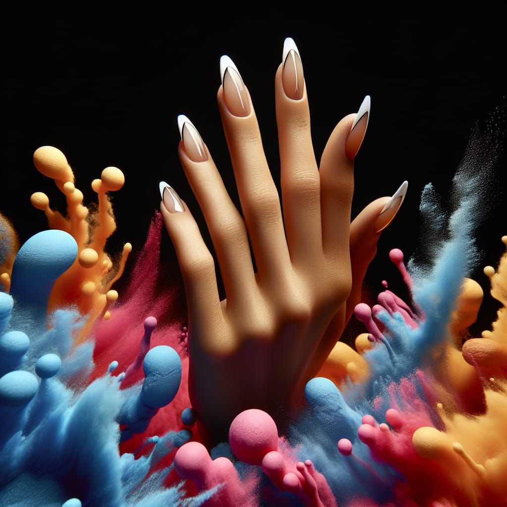 This image shows a close-up of a hand with almond-shaped acrylic nails and a white French tip design. The hyperrealistic concept art, captured at a 2/3 angle against a black background, features side lighting and vibrant colors.