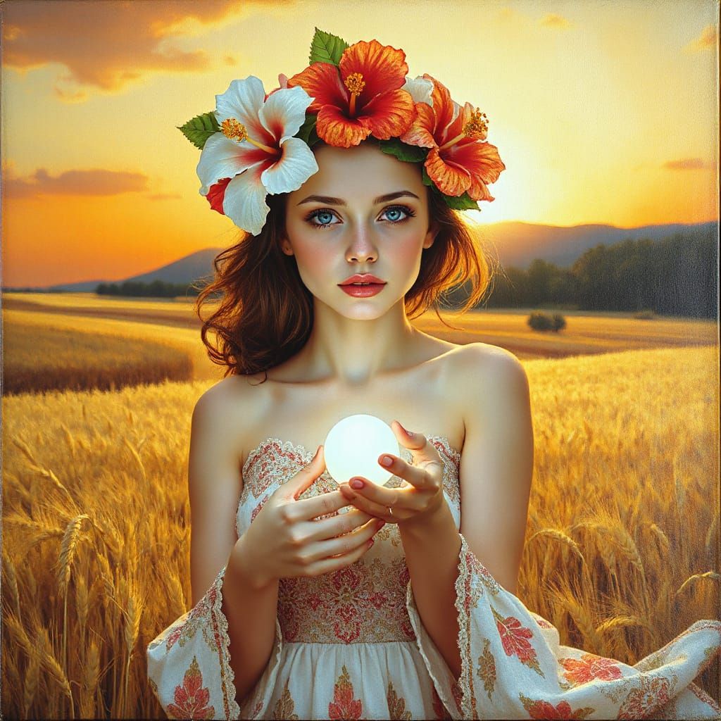 This striking image shows a woman with light brown hair and blue eyes, wearing a floral crown, in a wheat field at sunset. Rendered with delicate lines and intricate patterns, reminiscent of oil on canvas paintings.