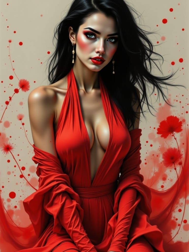 This image is a dramatic portrait of a person amidst a storm, set against a backdrop of luxurious fabrics, evoking a sense of danger and mystery.