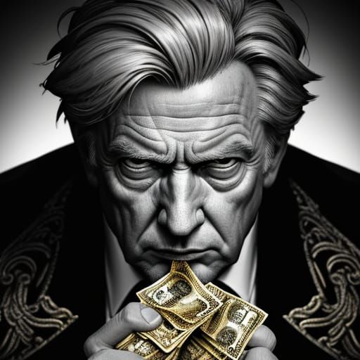 This image shows a monochrome portrait of a Roman Emperor eating money. The figure is dressed in a toga with golden accents, and the scene is lit with dramatic chiaroscuro.