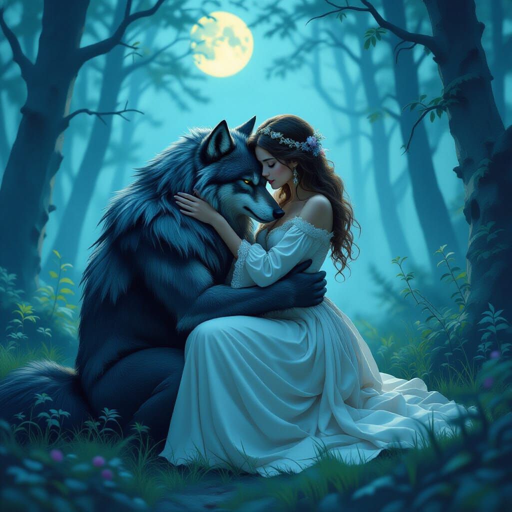 This image shows a tender embrace between a young woman in Renaissance attire and a werewolf, set within a misty forest under moonlight. The scene evokes a dreamy, ethereal fantasy aesthetic.