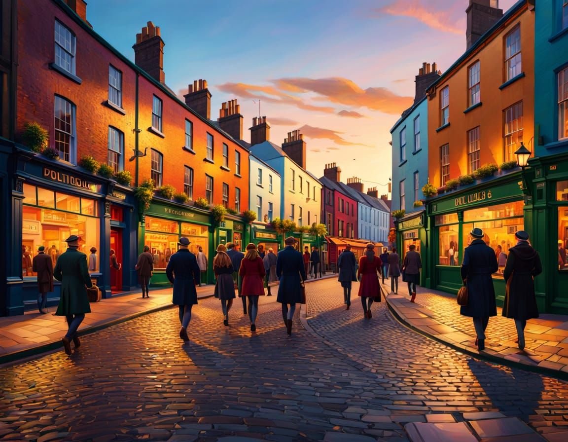 A vibrant oil painting of a lively Dublin street scene at golden hour. The image depicts people walking among historic buildings, with colorful street performers adding to the atmosphere.