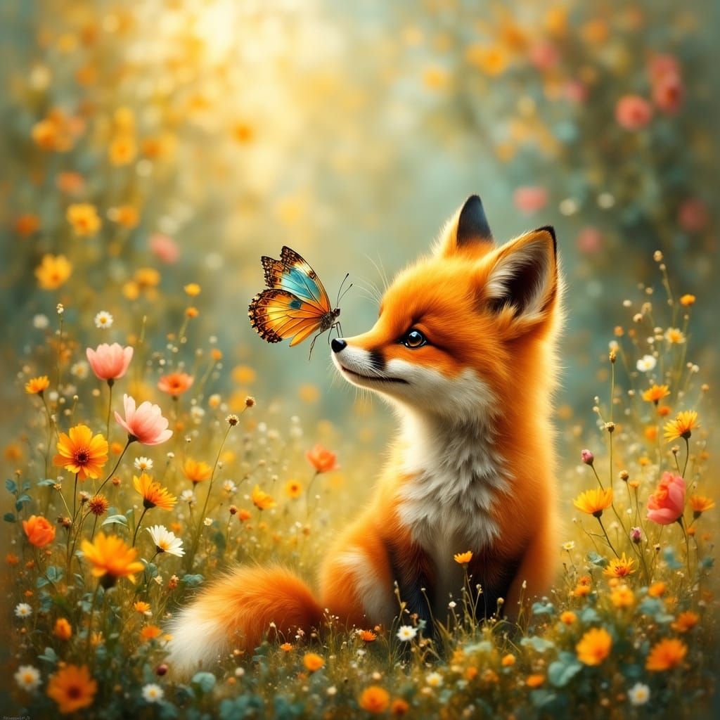 This image captures a serene moment of wonder as a baby fox discovers a delicate butterfly perched on its nose, set amidst a lush meadow of blooming Spring flowers in a highly detailed, dreamlike scene reminiscent of Arthur Rackham's concept art style
