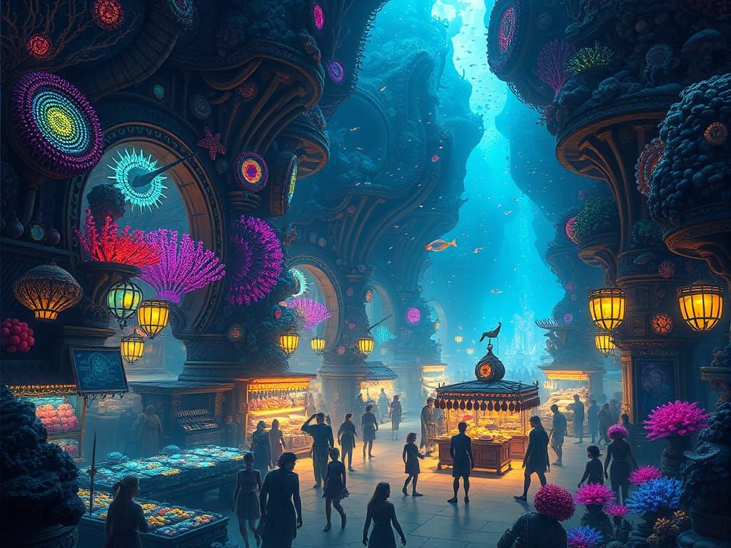 A vibrant underwater city market teeming with aquatic life. The scene is illuminated by bioluminescent coral, showcasing the trade of pearls and deep-sea artifacts in a Moebius-inspired style.