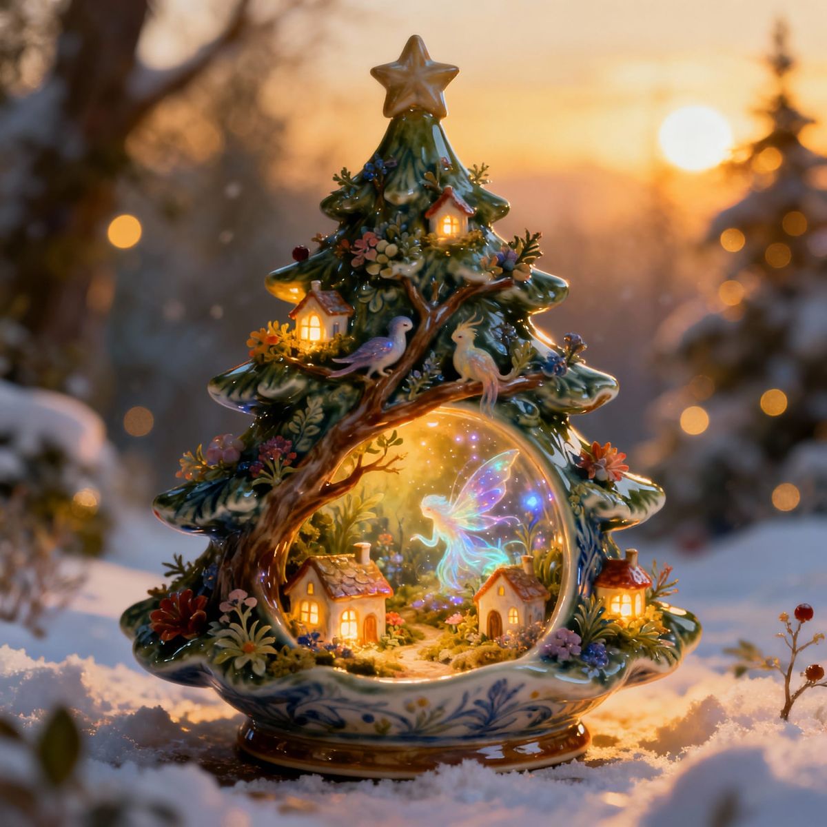 This image showcases a hidden pocket dimension within a ceramic Christmas tree. Tiny glowing homes and mythical creatures are nestled amongst its branches, illuminated by a warm, enchanting light.
