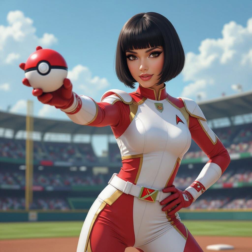 A full-body portrait of Loxy Bliss in a futuristic Pokemon trainer cosplay, dynamically posing with a Gardevoir. The image features a pokeball thrown towards the viewer with energy effects, in a dynamic, heroic style.
