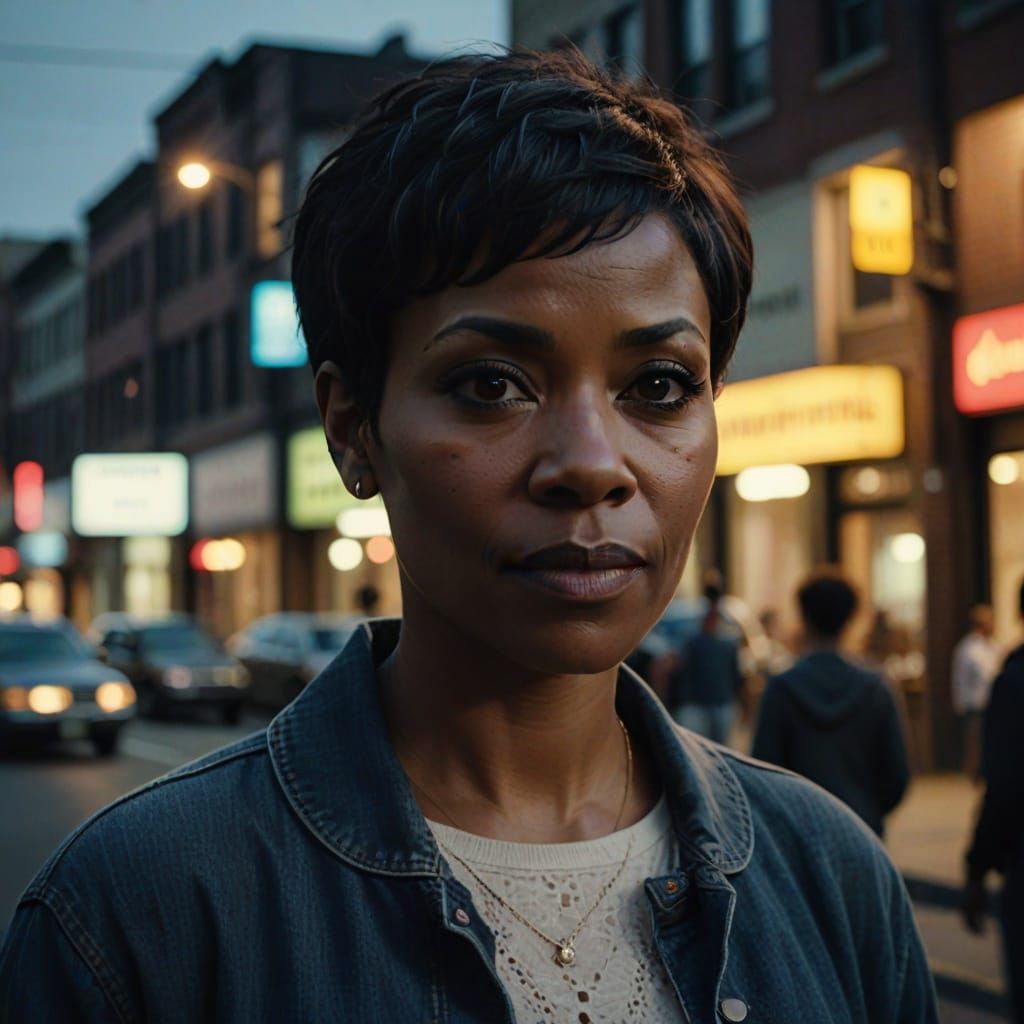 A medium shot film still capturing a 39-year-old African-American woman with short pixie hair and brown eyes in casual wear. Features cinematic lighting and film grain.