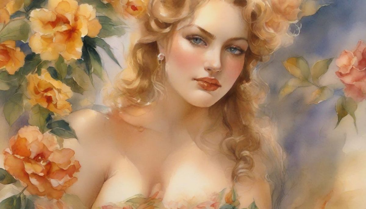 This image is a stunning watercolor painting of a beautiful woman posing in a lush, exotic environment. Soft focus and dreamy lighting create a romantic atmosphere, with elegant golden hues shining through misty surroundings.