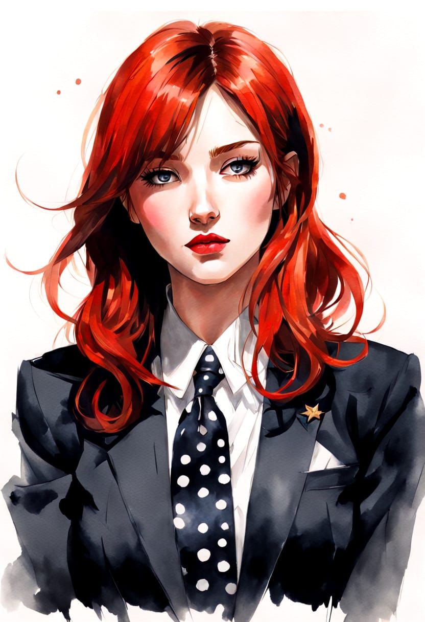 This image is a low-angle portrait of a young woman dressed in a high school uniform with a bold, polka dot pattern and gilded accents, rendered in a distinctive inkwash style.