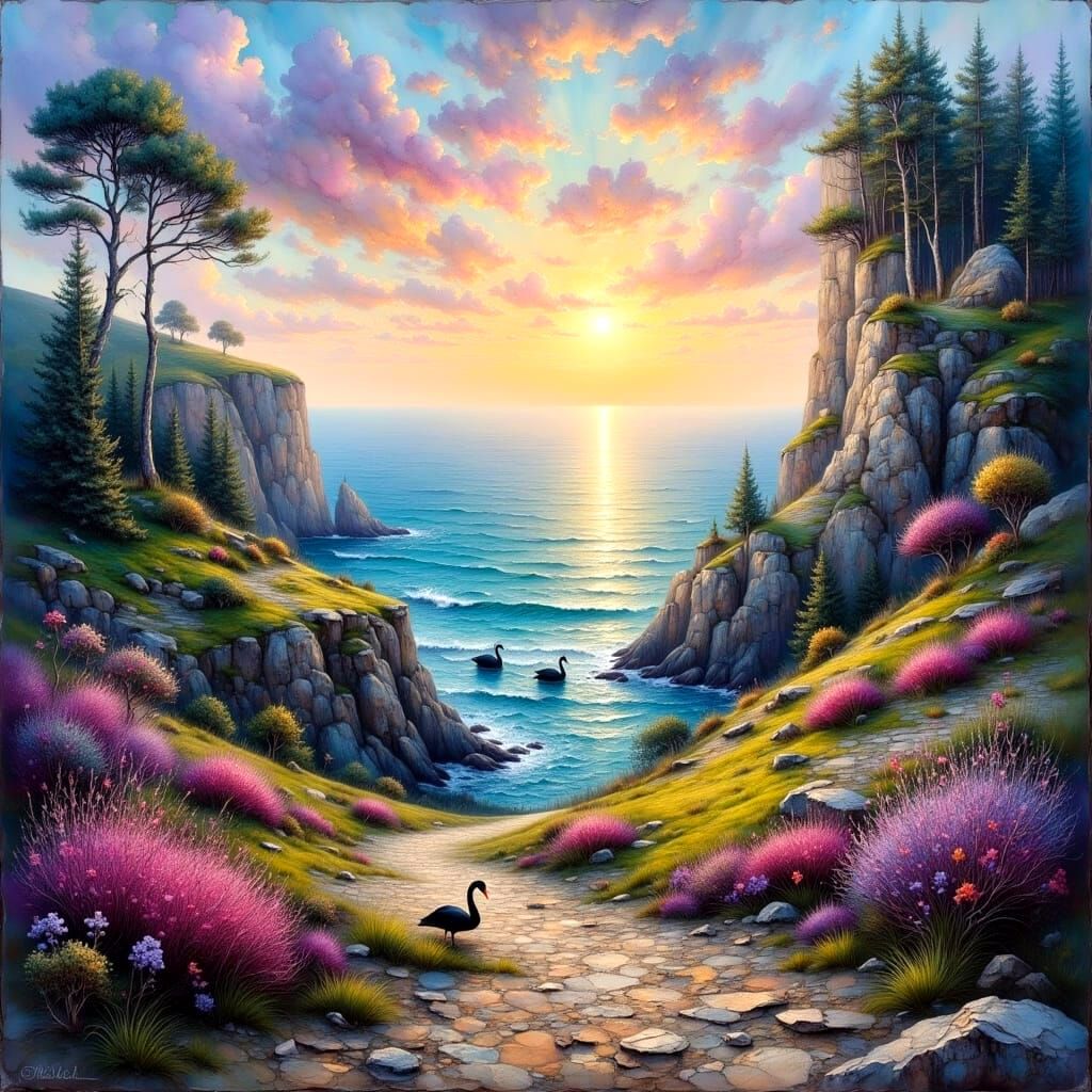 A striking picture of a fantasy landscape featuring black swans near the sea. Flat lands meet heather cliffs, with flowering trees under a sunset sky. An impasto oil painting aesthetic.