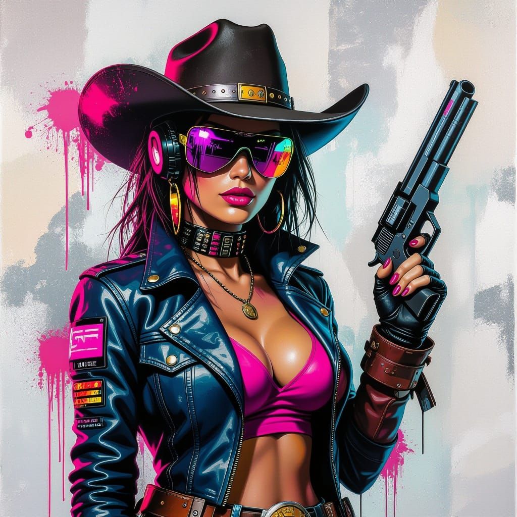 This image features a cyberpunk cowgirl rendered in a dynamic graffiti art style, utilizing spray paint and melting oil gouache techniques for a high-contrast, colorful, and ultra-detailed look.