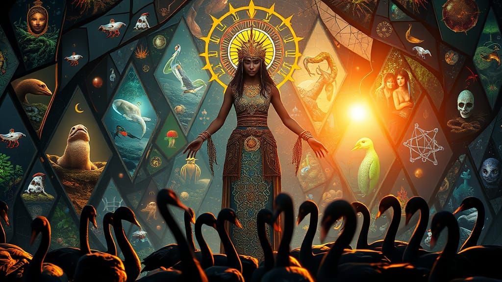 This image depicts a mystical shaman in a surreal labyrinth of cracked mirrors, reflecting dreamlike realities. It features intricate bio-art with glowing creatures and flora, in a psychedelic, cosmic surrealist style.
