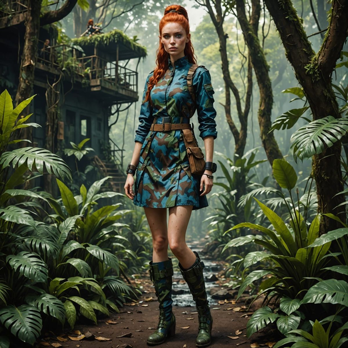 This image shows a young woman with red hair in a camouflage dress and high heels, standing in a dense jungle. The artwork features deep colors and intricate details, with a fantastical, matte painting aesthetic.