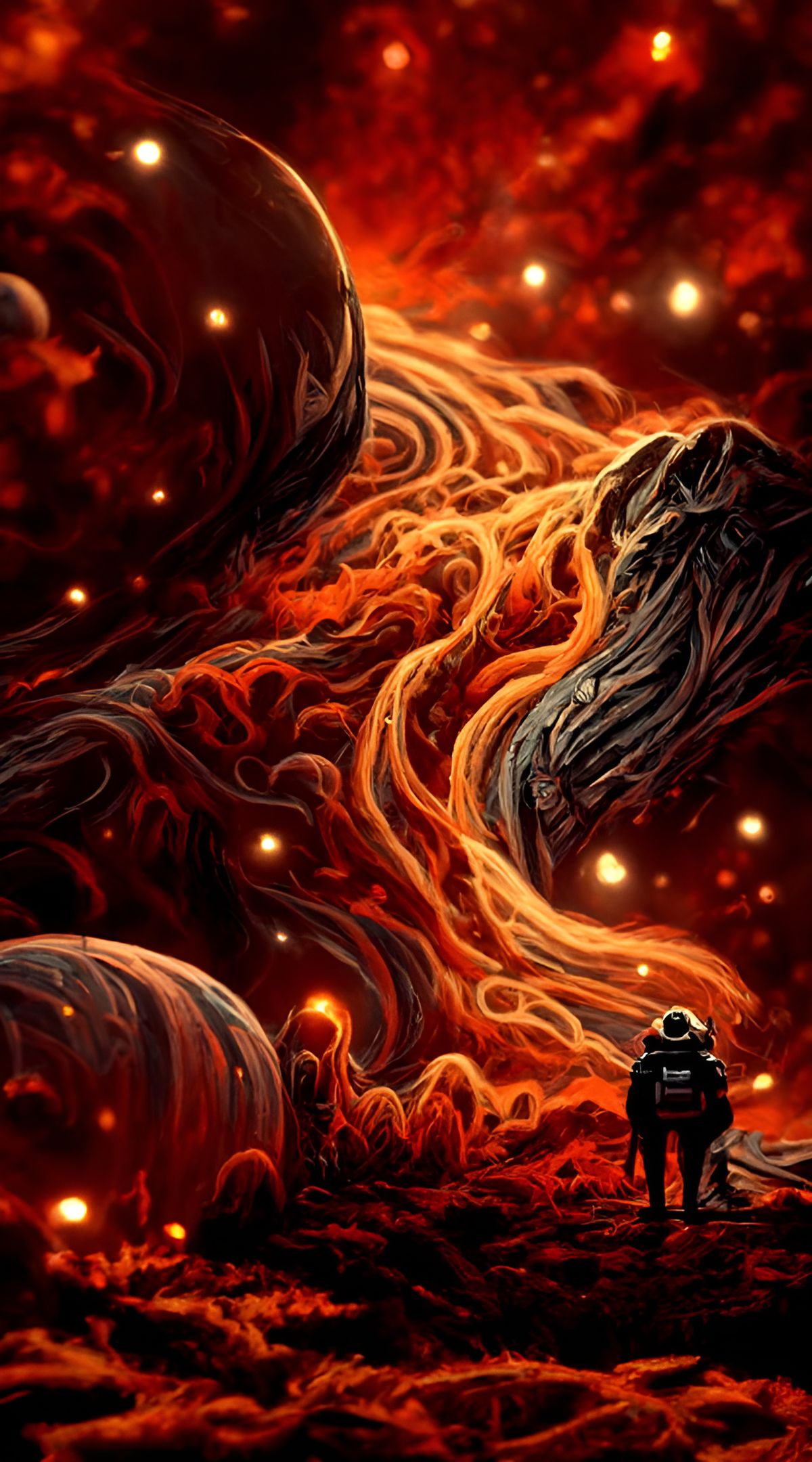 A stunning painting of a cosmic landscape in orange and black tones. The image evokes a dreamlike quality with its detailed and complex composition, reminiscent of expressionism in a sci-fi setting.