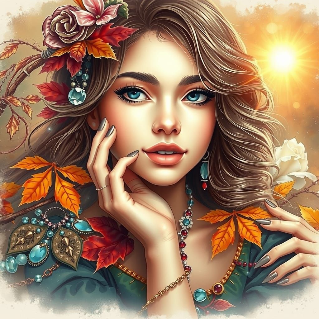 A striking picture of a woman in elaborate attire, adorned with beads and glass. She is surrounded by falling autumn leaves in this vibrant digital portrait with airbrushed watercolor effects.