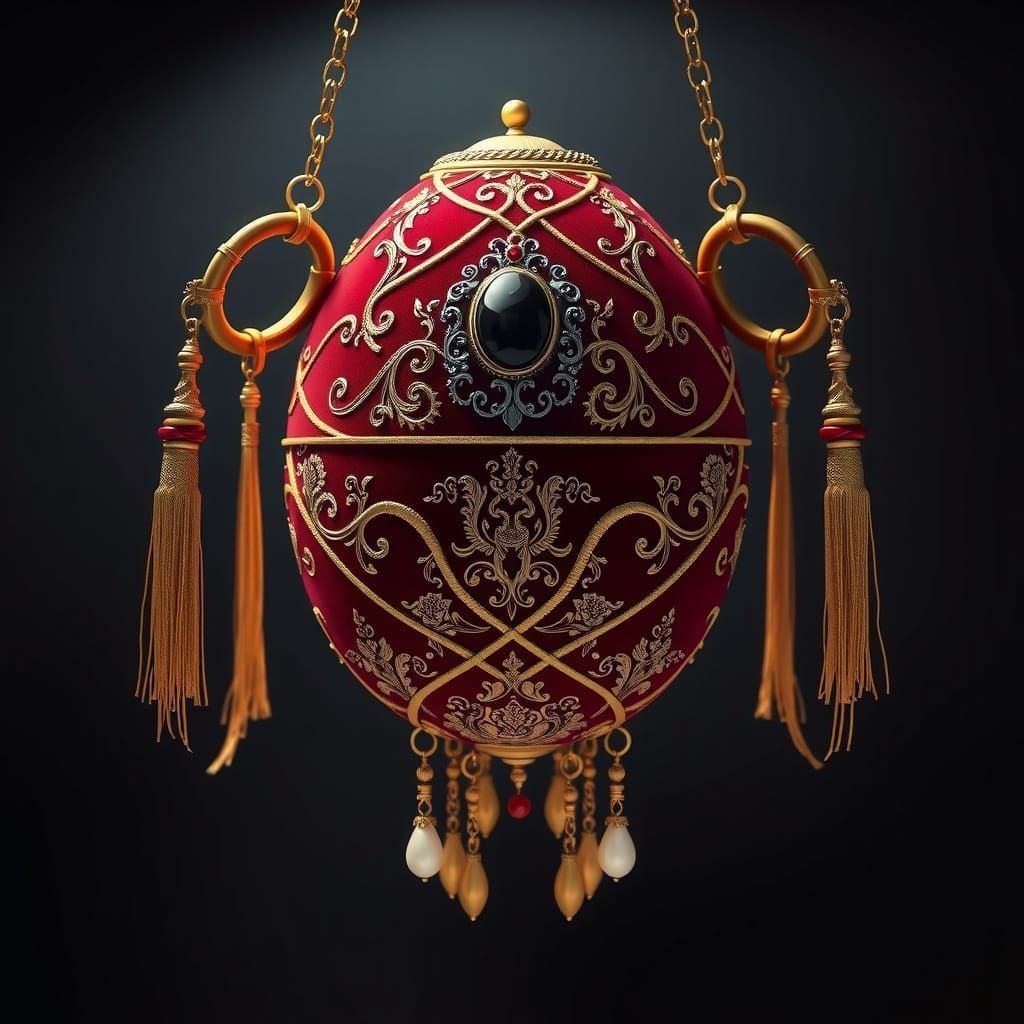This sumptuous, ornate Fabergé egg features intricate arabic woven patterns, golden tassels, and mysterious gemstones, evoking a dark fantasy world with opulent, eerie, and symbolic qualities.
