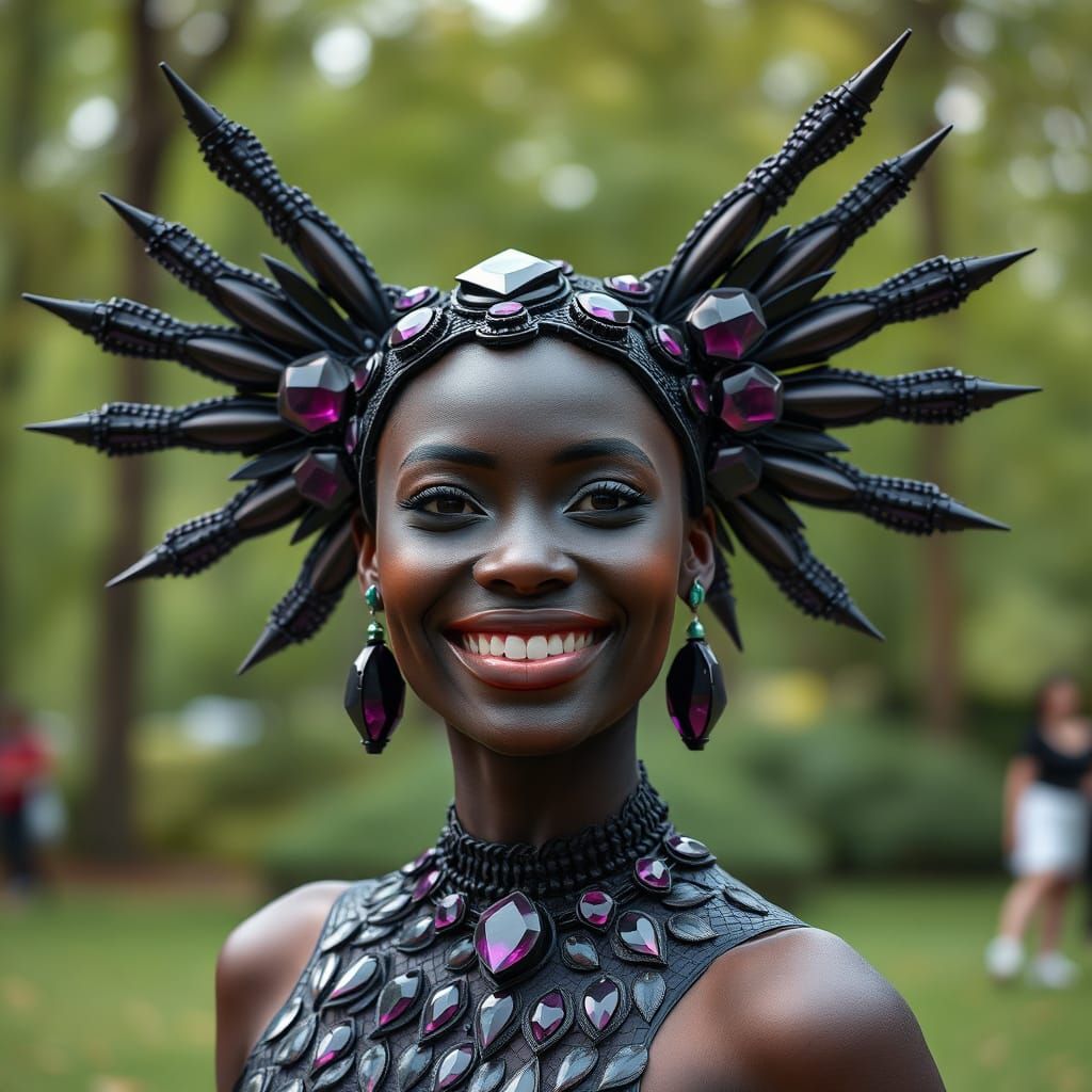This image shows a smiling dark-skinned woman in an artful outfit amidst land art in Central Park. Black tubular structures and purple rubies accent a futuristic fashion show with models in cobra scale outfits, rendered with photorealistic detail.