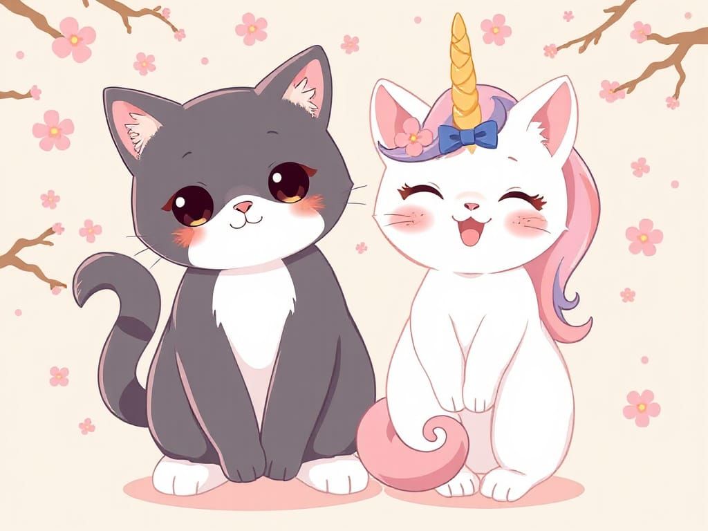 This image depicts cute kawaii cats and unicorns amidst cherry blossoms. The scene is rendered in a colorful pastel palette, reminiscent of Japanese kawaii anime.
