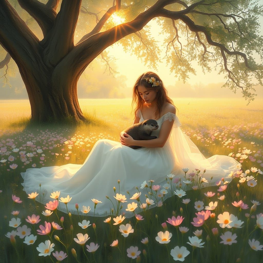A serene goddess sits in a pastel flower field, cradling an otter pup. Sunlight filters through trees, creating a dreamy, impressionistic scene with delicate brushstrokes.