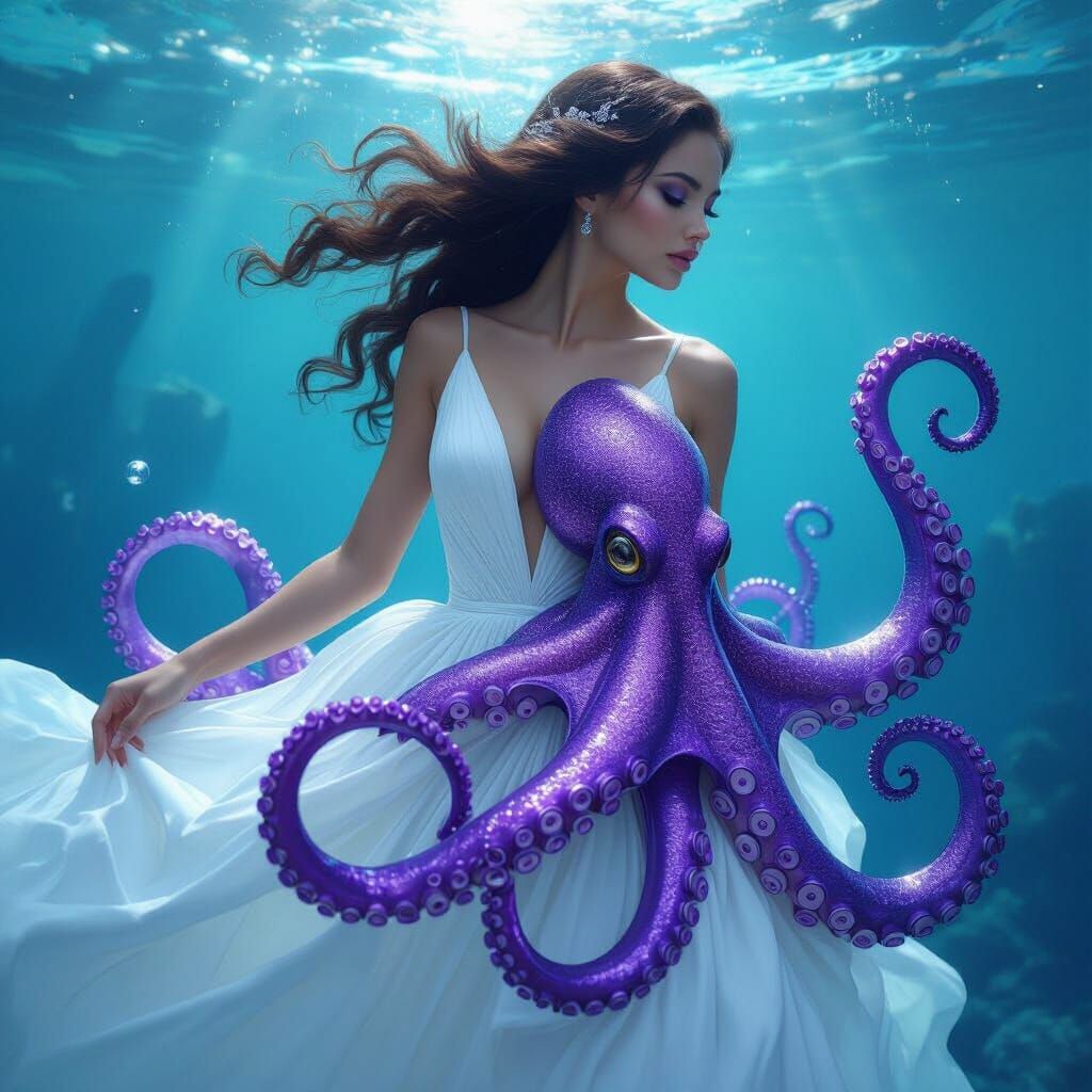 This image shows a beautiful woman in a flowing white dress, half her body morphing into shimmering violet octopus tentacles. This digital art has a futuristic, biomechanical aesthetic.