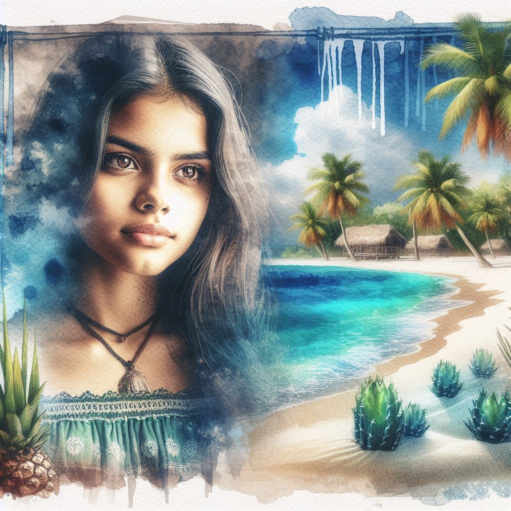 This image shows a young Latina girl amidst a tropical island dreamscape. Palm trees, white sand beaches, and a tranquil sea create a nostalgic watercolor painting.