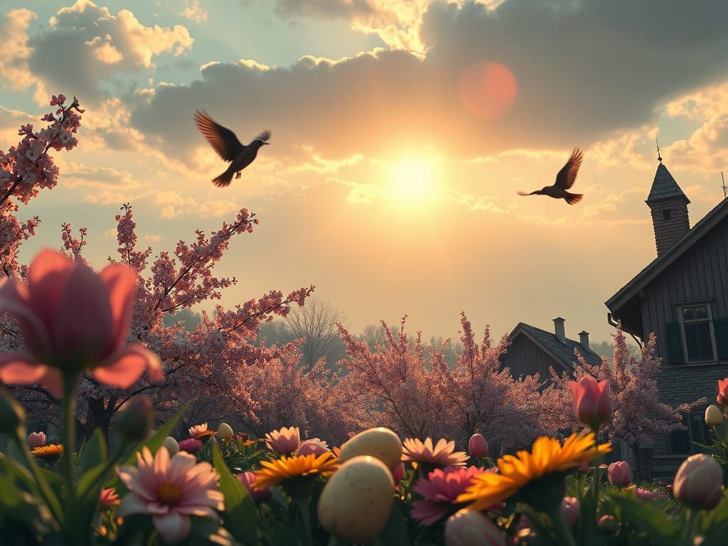 Easily generate your own spring and Easter images with our free AI image generator, featuring blooming trees, flowers, and birds.