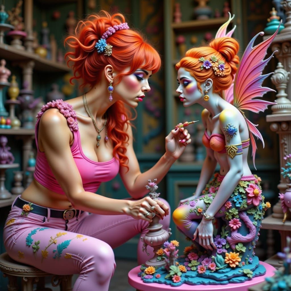 This image shows a detailed woman crafting a fairy from iridescent clay, rendered in a vibrant pulp comic aesthetic with rich colors and high definition.