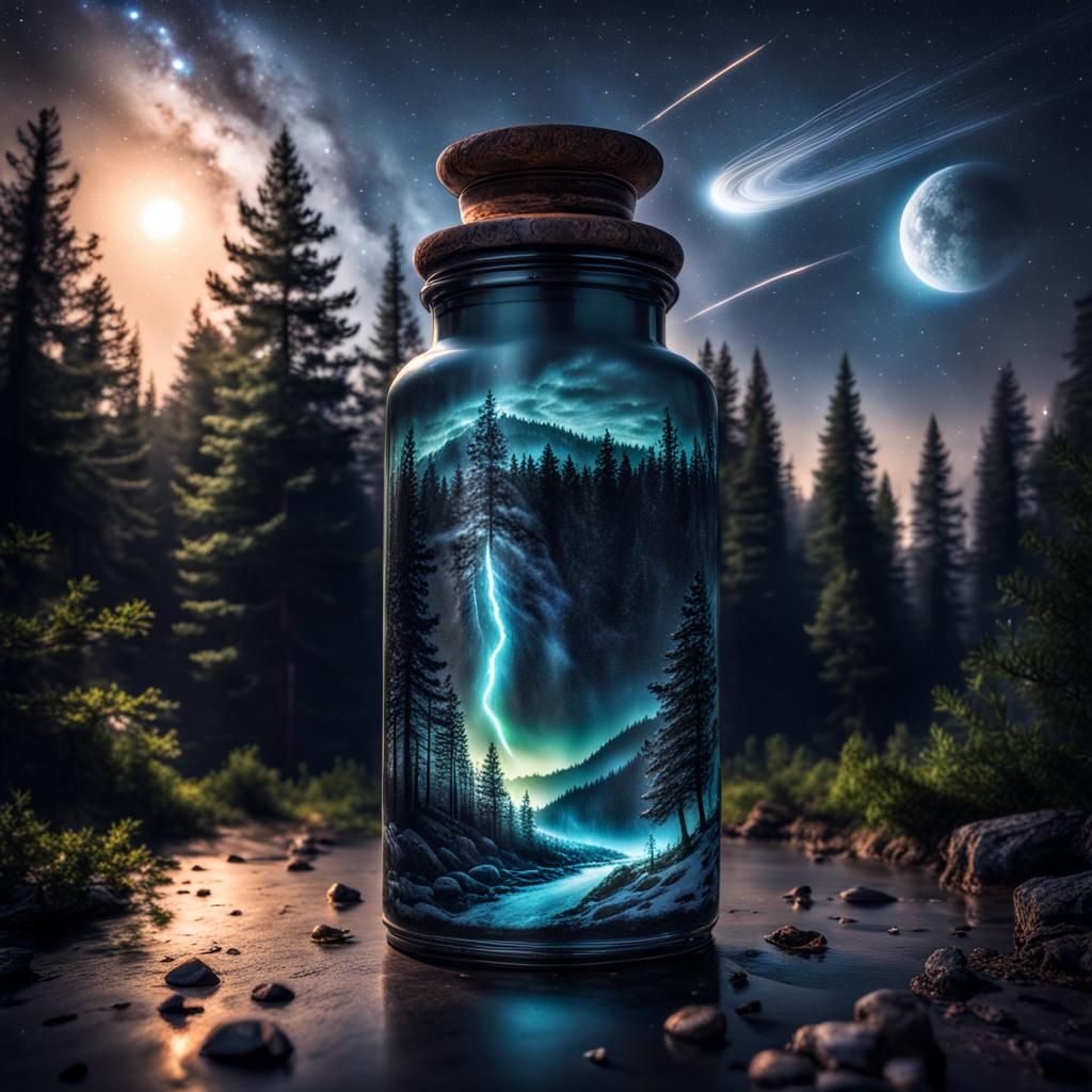 A captivating image of a twilight forest under a starlit night sky, complete with a comet streaking across the horizon. The photo features dramatic lighting and a hyperrealistic aesthetic.