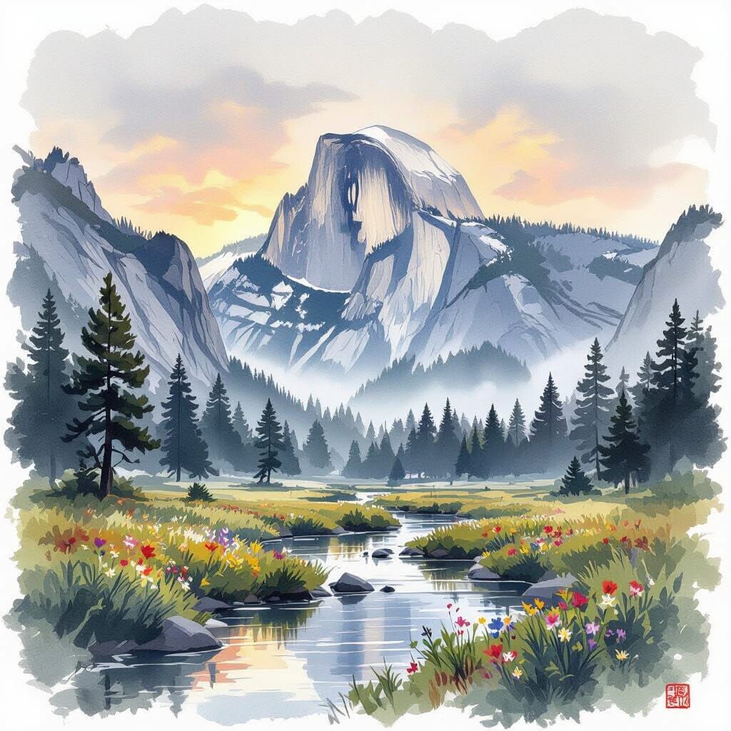 Watercolor painting by Dong Qichang, modern ink painting, Half Dome Yosimite National Park dawn, towering grey mountains , soft sky. Lush junipers, wildflowers, winding stream with reflections, misty valley floor. Opaque. Pencil sketch, charcoal drawing.