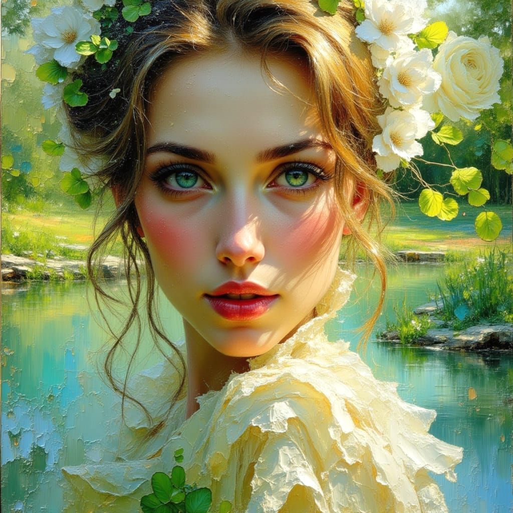 A striking picture of a beautiful Arabic woman with blue-green eyes. The soft landscape features pools, ponds, and a cityscape illuminated by crepuscular rays in this textured impasto oil painting.