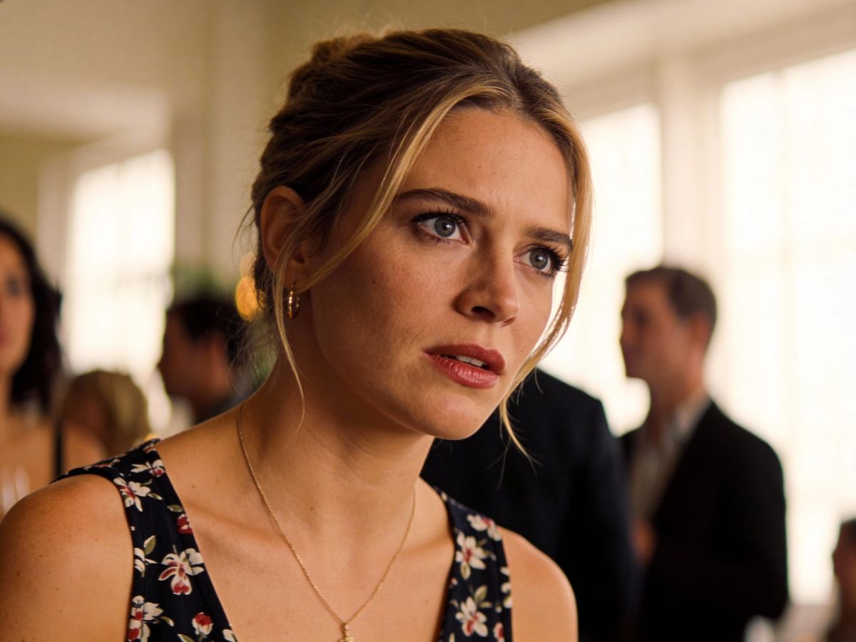 A candid close-up photograph of a woman intensely staring across a room at a cocktail party. Captured with natural lighting and a portrait lens, featuring a blurred bokeh background.