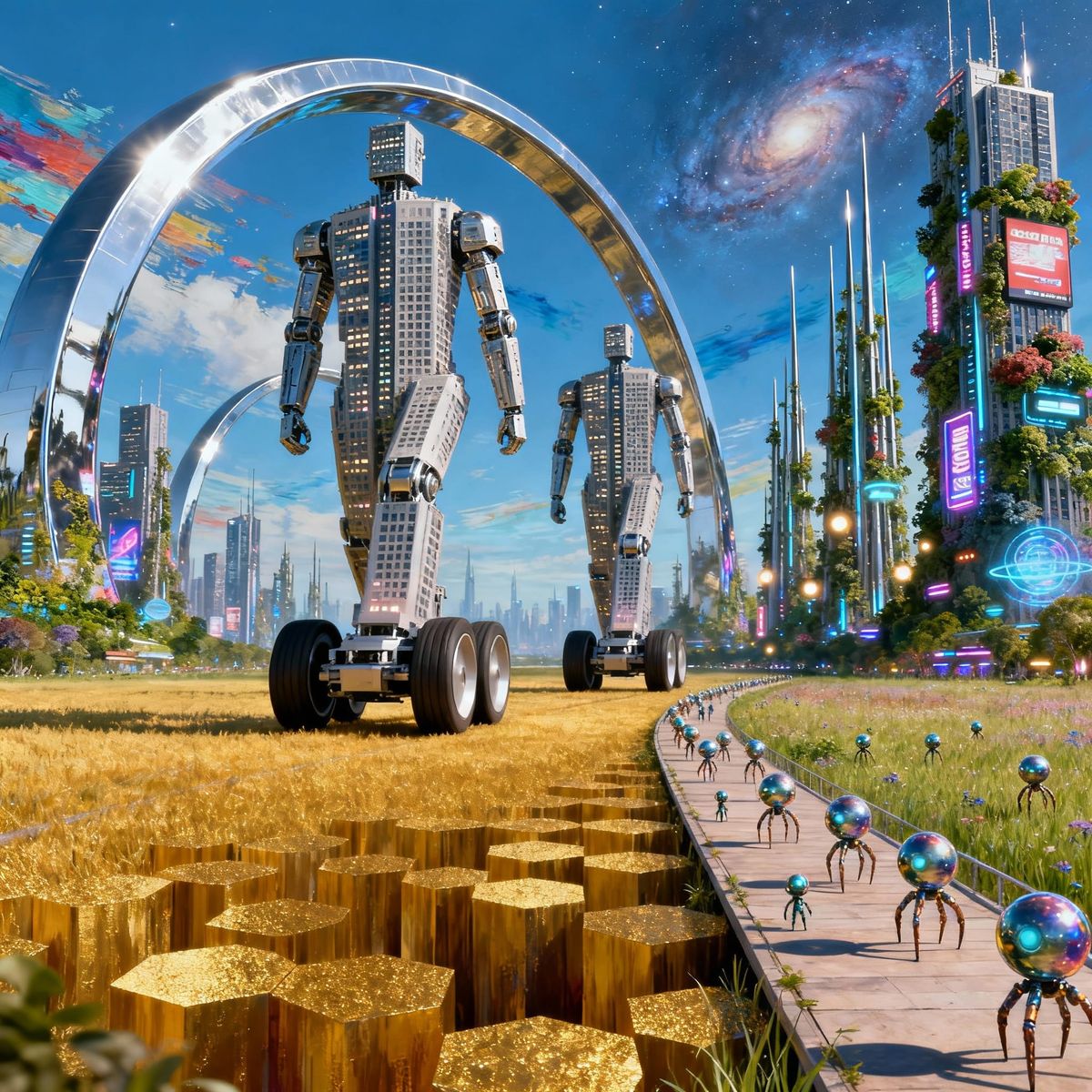 This hyper-realistic cinematic photo shows massive human bodies as skyscrapers on wheels moving through a futuristic city. Features chrome arches, fluidic skyscrapers, and a vibrant painted background.