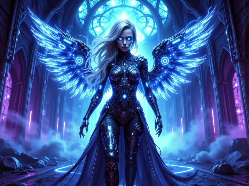 This image shows a cyberpunk angel with blonde hair and electric blue eyes, striking a heroic pose. She wears sleek armor and has metallic wings etched with glowing runes. The background is a neon-lit cyberpunk church.