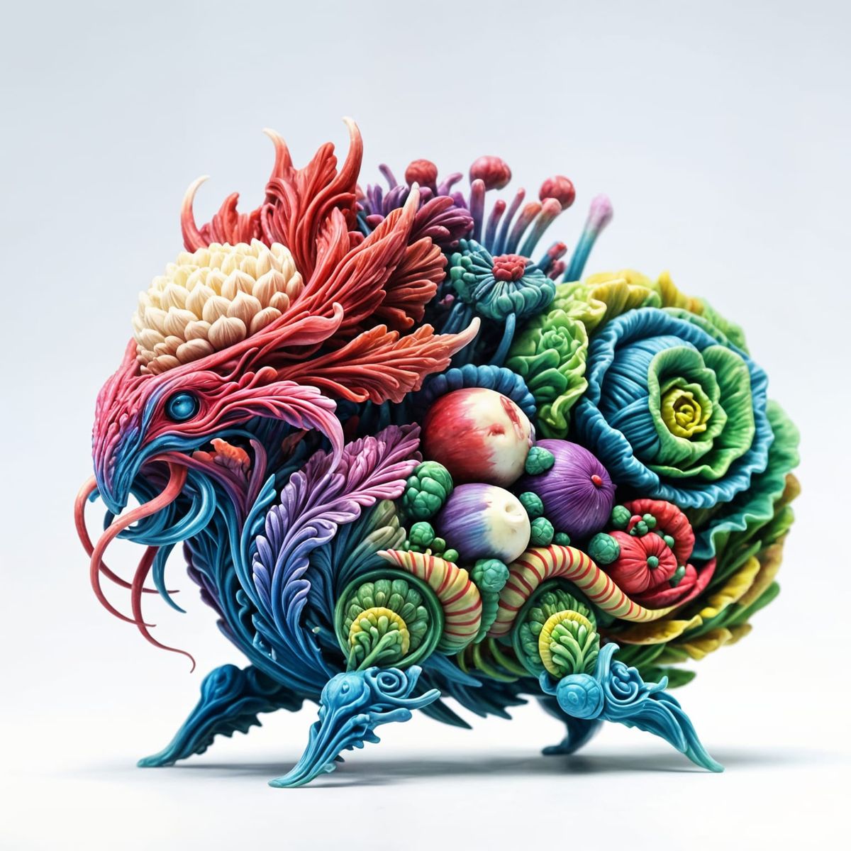 A 3D plastic miniature collector's model depicting a creature that seems to be surrealistically derived from a combination of a flower, radish, and cabbage. The creature encompasses a double exposure of colorful botanical motifs, evoking a sense of meticulous mystery and psychedelic magnificence. It ...