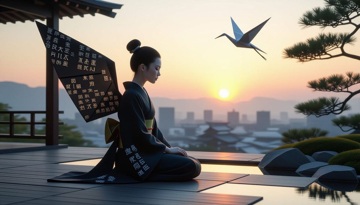 A striking picture of Nyma, a matte black android in Japanese attire, in a rooftop zen garden. Her origami wings unfold silently as an origami crane flies behind her in a minimalist, photorealistic style.