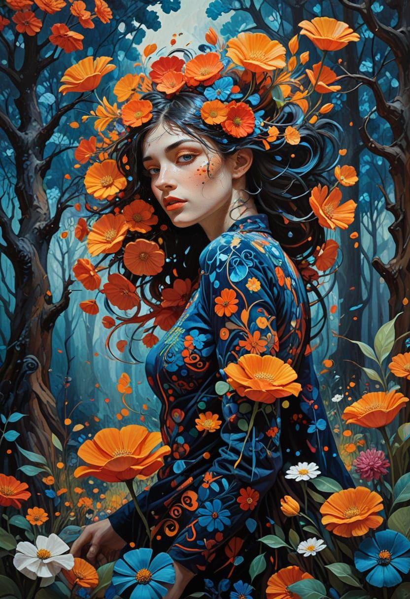 "Young woman with a beautiful face and a direct gaze Love Forest, wood, flowers, rocks in the woods, (a mix of orange, black, white, blue, red), magic, mystical, popart, illustration, surreal art, abstract art, Klimt circles, Picasso art, Dalì simbolism, patterns abstract, deep color and bright, oil painting by James Gurney concept art, Artgerm, vivid color, dynamic vivid lighting hyperdetailed, intricately detailed, Splash art trending, triadic colors,"