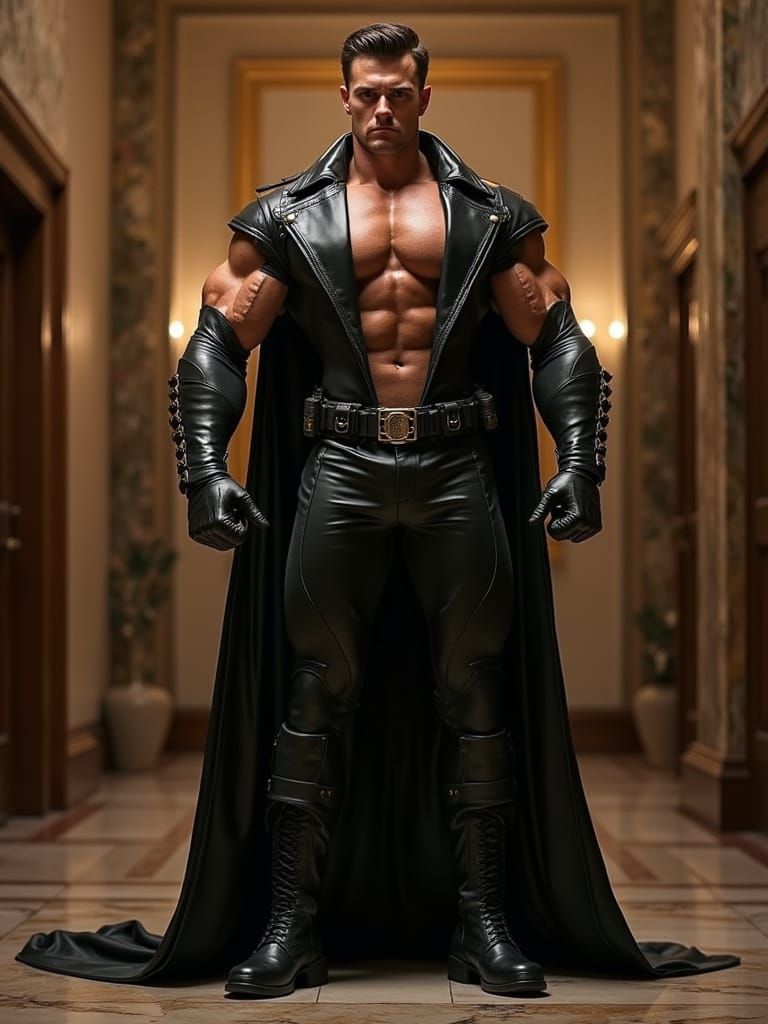 This image shows a muscular superhero in tactical gear and a tailcoat, standing in an ornate foyer. The scene exudes refined elegance.