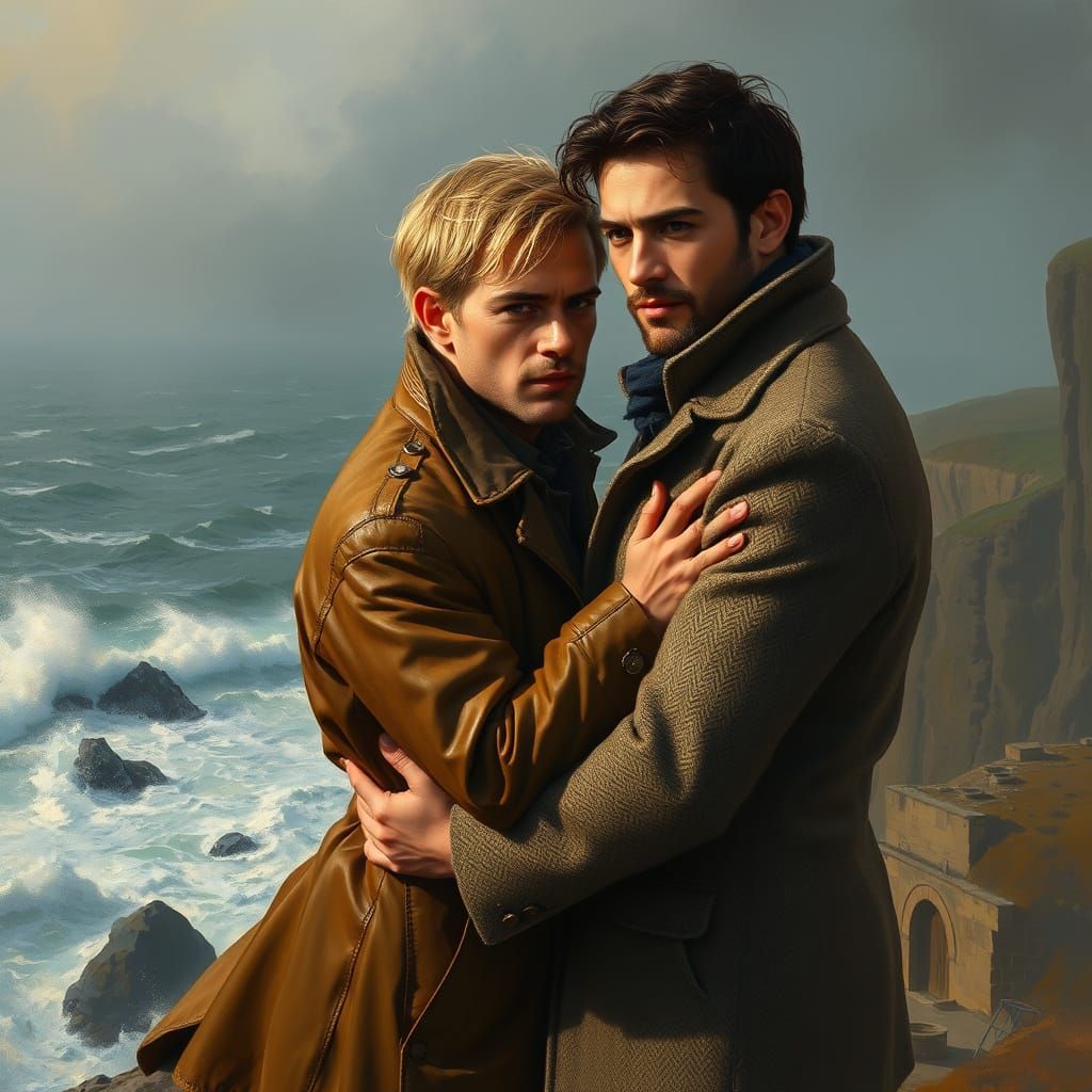 This image shows two men embracing on a cliff, with a stormy sea as backdrop. The artwork evokes impressionistic paintings with soft lighting and visible brushstrokes.