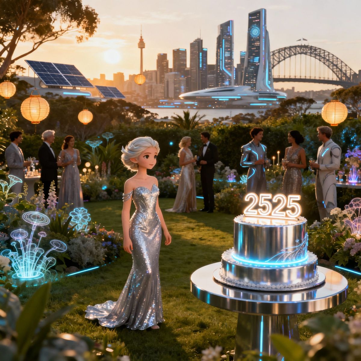 A realistic depiction of a birthday celebration for a petite goddess in Australia during the year 2525, showcasing a futuristic scene.