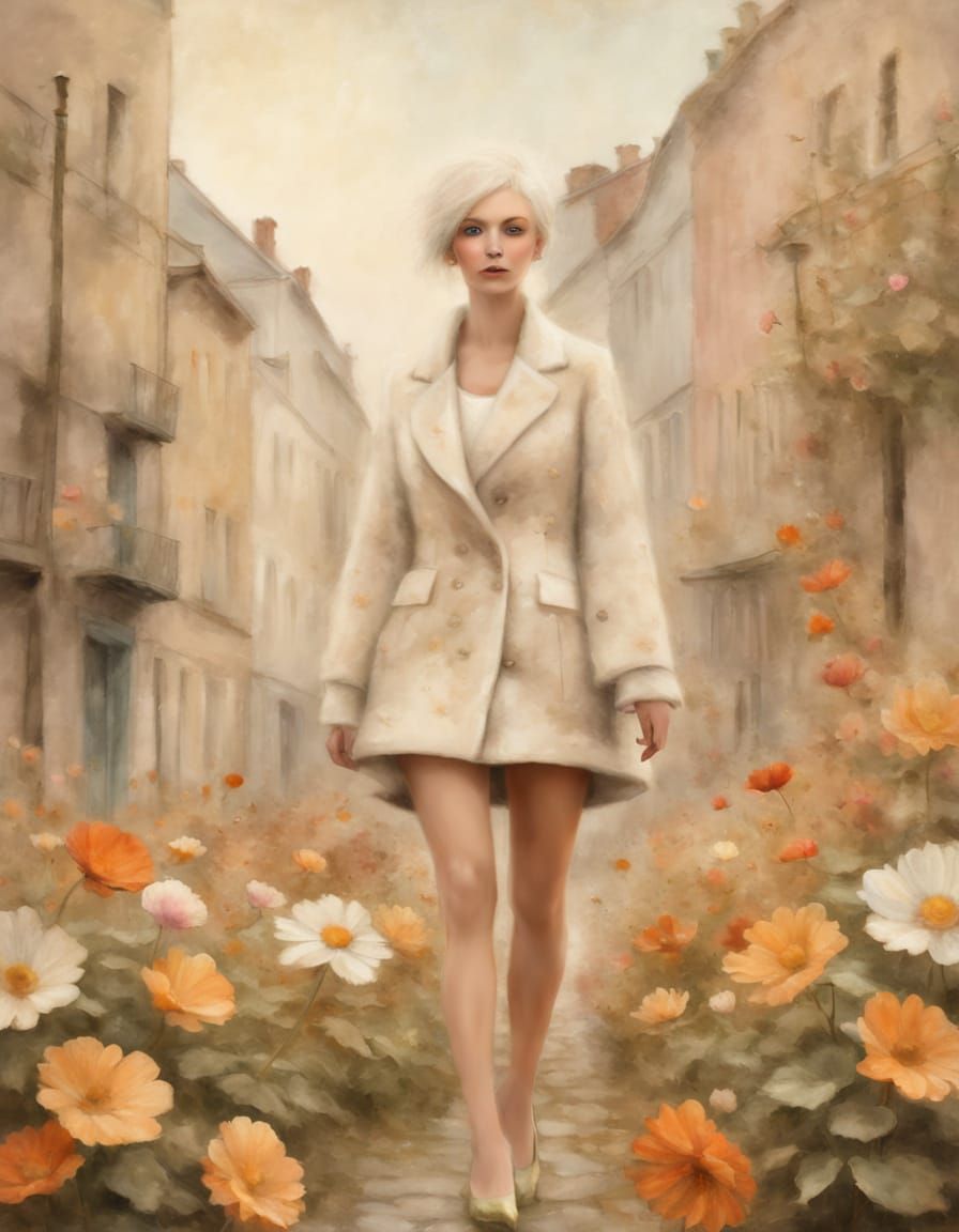 This image shows a stylish woman with platinum hair and an hourglass figure in a beige miniskirt suit. The background features chaotic floral elements in a Maggie Vandewalle and Jamie Heiden style.
