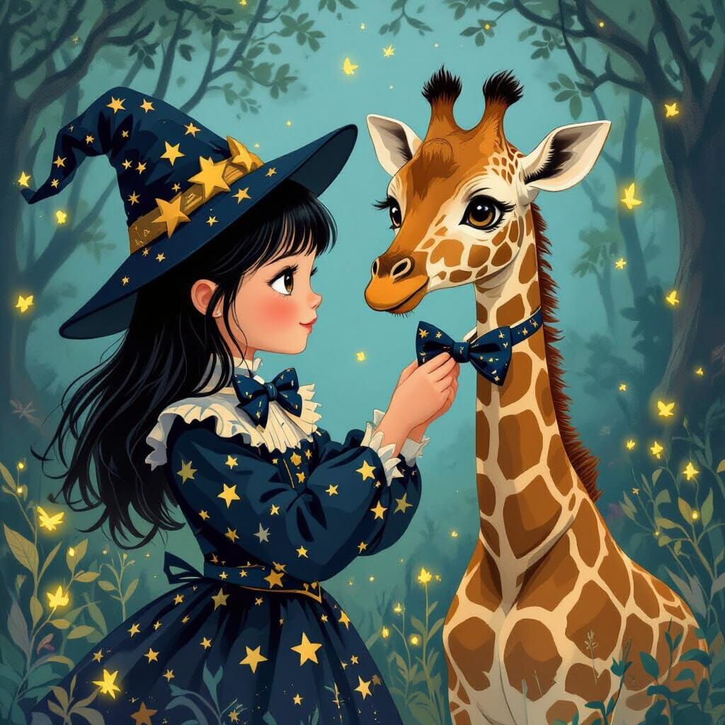 This image shows a young witch girl with dark hair dressing her giraffe pet with a bowtie in an enchanted forest. Rendered in a vibrant, storybook illustration style with a dreamlike atmosphere.